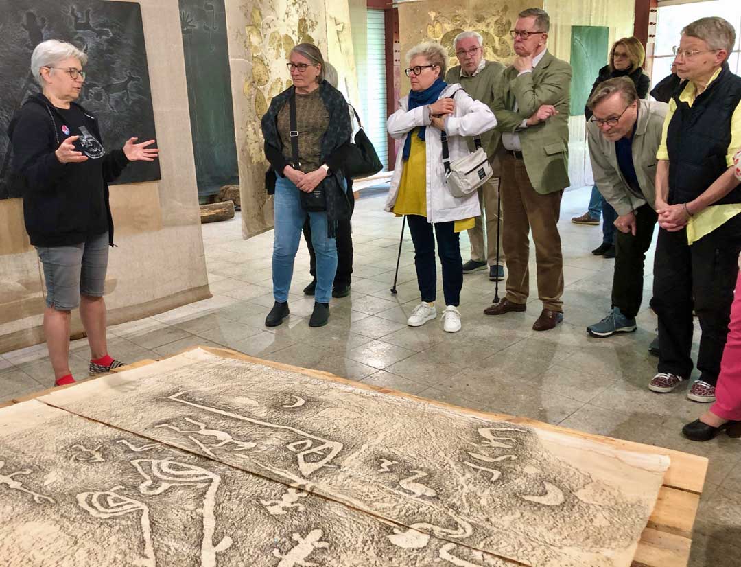Palmsen kartanon lähelle avatun muinaistaidenäyttelyn työt tuovat viestiä 6 000 vuoden takaa ja avaavat tuon ajan ihmisten maailmankäsitystä. Teokset ovat kopioita Äänisjärven kalliopiirroksista, jotka itse asiassa ovat kivityökaluilla tehtyjä uurroksia. Vanhaan myymälärakennukseen pystytettyä näyttelyä esitteli professori Kadi Pajupuu.