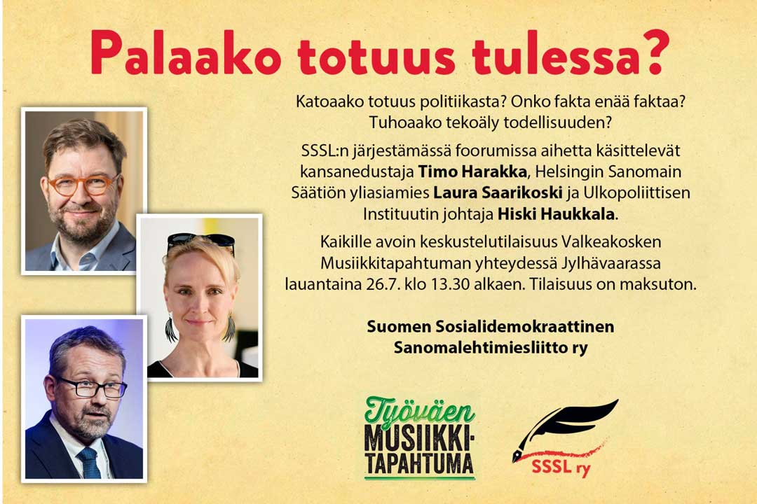 SSSL:n jäsenet kokoontuvat tuttuun tapaan Valkeakosken Työväen Musiikkitapahtuman yhteydessä järjestettävään keskustelufoorumiin. Lauantaina 26.7. klo 13.30 alkavassa tilaisuudessa keskustellaan totuudesta. Katoaako totuus politiikasta, voiko faktoihin tekoälyn aikakaudella enää luottaa?